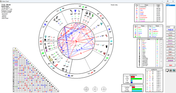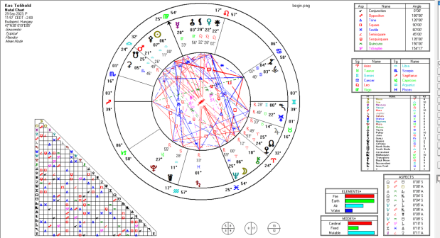 A téridő pillanatról készített horoszkóp tengelyei is a változó energiákat mutatják. A Nyilas tüzes, változó jegyében tartózkodó Aszcendens a hitünket segíti: higgyünk magunkban és az égiekben.